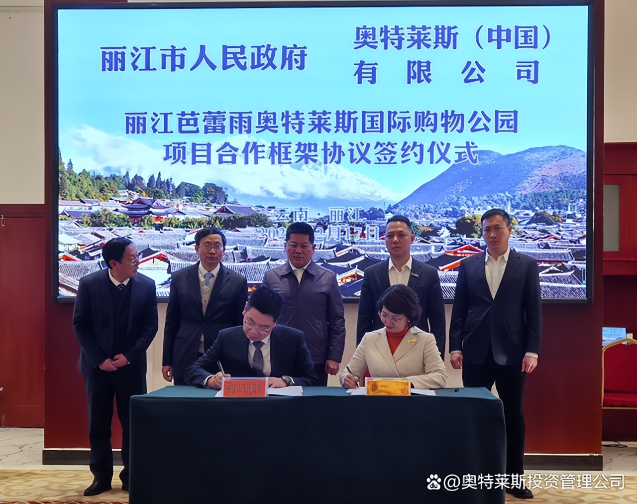 2月17日,奧特萊斯(中國(guó))有限公司總裁拜訪麗江市政府,與麗江市蘇永忠市長(zhǎng)在麗江座談,并見證《麗江芭蕾雨奧特萊斯國(guó)際購(gòu)物公園項(xiàng)目合作框架協(xié)議》的簽署。奧特萊斯(中國(guó))助理總裁李曉薩、投資拓展中心總經(jīng)理周毅,以及麗江市政府、市發(fā)改委、市投資促進(jìn)局、市住房和建設(shè)局、市文旅局、玉龍雪山管委會(huì)、玉龍縣政府等主要領(lǐng)導(dǎo)參會(huì)。