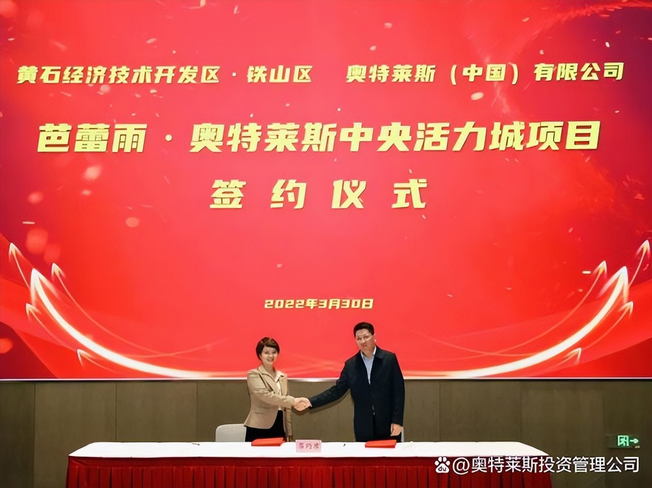 3月30日,奧特萊斯(中國(guó))有限公司總裁拜訪黃石市政府,與黃石市吳之凌市長(zhǎng)進(jìn)行會(huì)談,并與黃石市經(jīng)開區(qū)·鐵山區(qū)簽署“黃石芭蕾雨·奧特萊斯中央活力城項(xiàng)目”合作協(xié)議。黃石市政府、經(jīng)開區(qū)管委會(huì)·鐵山區(qū)政府相關(guān)部門,以及公司助理總裁李曉薩參會(huì)。