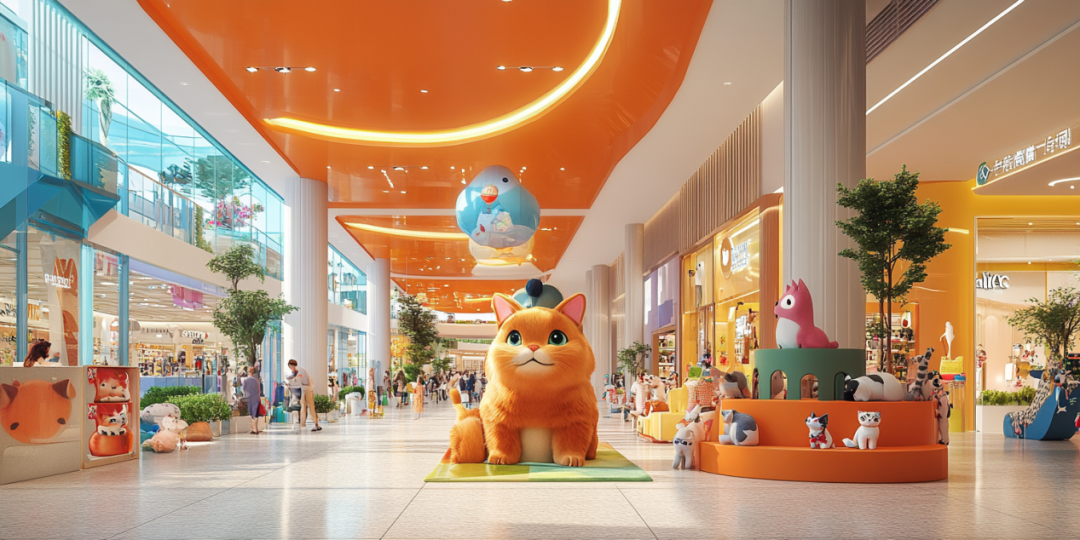 A場(chǎng)景:位于寵物友好購(gòu)物中心一層,連接室內(nèi)外區(qū)域有家寵物零售店,店門口提供寵物推車,貨品陳列展臺(tái)尤其是寵物玩具類展臺(tái)略高于寵物推車,與寵物視線基本持平。店鋪店員自帶友好氣質(zhì),對(duì)來(lái)訪寵物的主動(dòng)親親貼貼毫無(wú)抵抗力。店內(nèi)到處可見(jiàn)主人們各自推著小車帶著貓貓狗狗,三三兩兩聚在一起聊著自家寶貝的名字、習(xí)慣與性格。直接進(jìn)入商場(chǎng)或從店鋪進(jìn)入商場(chǎng)都無(wú)需回避安保人員的“眼神拷問(wèn)”,符合城市飼養(yǎng)規(guī)范的寵物均可自由進(jìn)場(chǎng)。