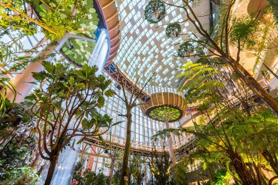 以“一日微度假勝地”為定位的上海南翔印象城MEGA,不僅融合了多元業(yè)態(tài),還巧妙地融入了植物園等自然生態(tài)元素。在建筑設(shè)計(jì)上,其外立面以“梯田山丘”為靈感,打造出上海罕見的退臺(tái)花園;在商場(chǎng)內(nèi)部,創(chuàng)造性地引入了森林、濕地等自然景觀,構(gòu)筑了一座占地約600平方米、高達(dá)5層、擁有200多種國(guó)內(nèi)外植物的跨層生態(tài)植物園。