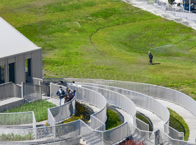 在建設(shè)空間設(shè)計(jì)上,項(xiàng)目將市場與公共綠地完美融合,摒棄了傳統(tǒng)菜市場簡單金屬棚的形式,屋頂打造為被草地和花田覆蓋的公園。建筑呈現(xiàn)為一個(gè)簡單的開放式結(jié)構(gòu),起伏的綠色屋頂猶如延綿的山丘,屋頂?shù)臇|側(cè)角落是一塊種植著繽紛植物和花卉的階梯狀區(qū)域,屋頂從該側(cè)向下延伸至地面,使游客可以輕松到達(dá)建筑頂端。在建筑的側(cè)面,一個(gè)簡單的四層結(jié)構(gòu)容納了市場的行政辦公室和展覽中心,后者可用于展示當(dāng)?shù)氐霓r(nóng)業(yè)產(chǎn)品。