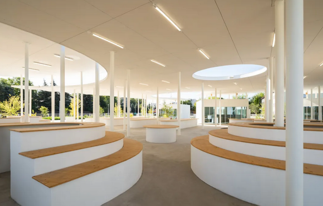 此外,廣場光滑的混凝土面層沒有路緣石,無論是步行、坐輪椅還是滑滑板都可以在市場上安全自由地移動(dòng),方便了不同人群的使用,體現(xiàn)了設(shè)計(jì)的人性化和包容性;各種街道固定裝置如白色的圓形信息板、自行車架、巨石、鳥類和昆蟲屋及社區(qū)共用桌椅等點(diǎn)綴其中。在極具特色的有機(jī)屋頂下,還設(shè)有帶木雕動(dòng)物造型搖椅的游樂花園,為集市增添了藝術(shù)氛圍和趣味性。