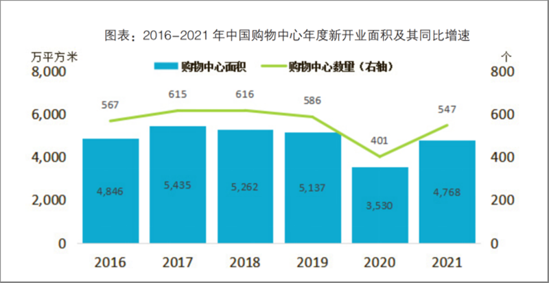《白皮書》在“2021年中國零售市場最新發(fā)展”部分指出,2021年,中國實(shí)現(xiàn)GDP(國內(nèi)生產(chǎn)總值)114.4萬億元,穩(wěn)居全球第二大經(jīng)濟(jì)體,全年社會消費(fèi)品零售總額達(dá)到44.1萬億元,同比增長12.5%。同時,中國在運(yùn)營購物中心數(shù)量達(dá)到6387個,總面積達(dá)到4.75億平方米。其中,2021年新開業(yè)購物中心數(shù)量為547個,總面積為4768萬平方米。中國“購物中心年新開業(yè)面積/在運(yùn)營面積”比例持續(xù)下降,2021年年末降至0.1。中國已經(jīng)進(jìn)入購物中心存量時代。